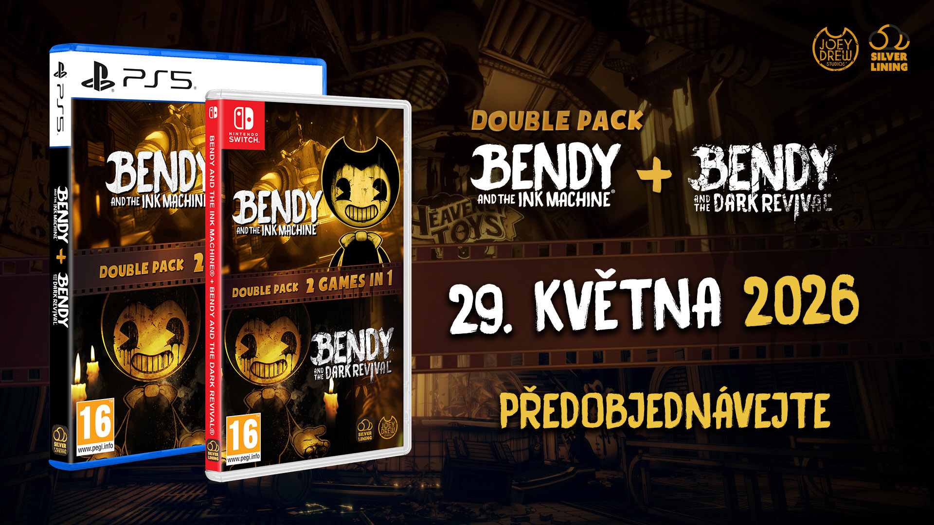 Kolekce Bendy Double Pack obsahuje hry Bendy and the Ink Machine a Bendy and the Dark Revival na jednom disku/cartridgi.