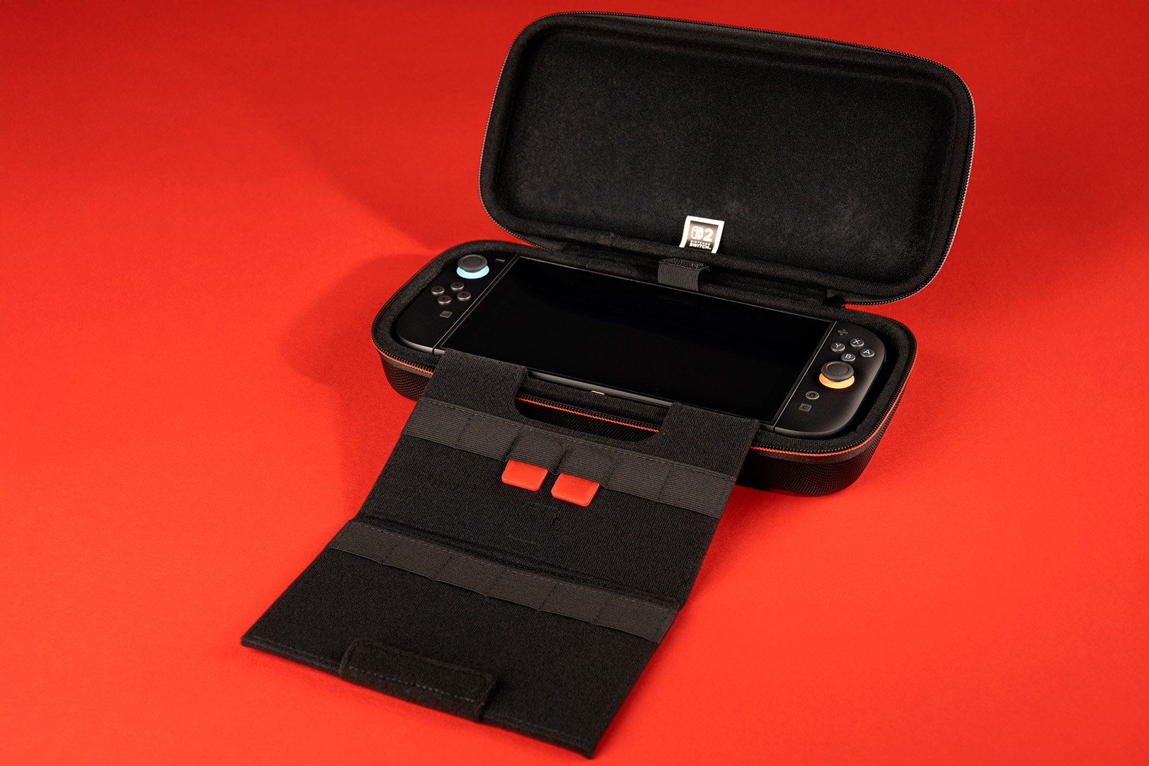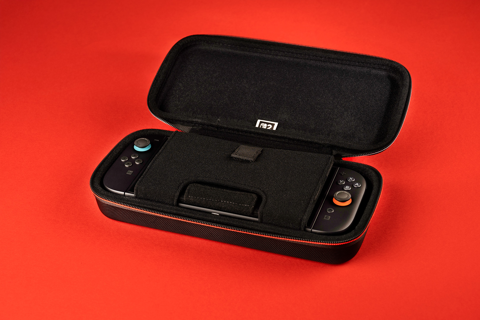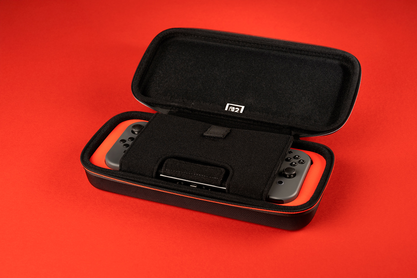 V tomto luxusním cestovním pouzdru od společnosti Nacon můžete bezpečně a pohodlně přenášet nejenom novou herní konzoli Nintendo Switch 2, ale také herní konzoli Nintendo Switch nebo Switch – OLED Model. Ústředním prvkem tohoto pouzdra je nastavitelný stojánek, který při hraní umožňuje pohodlněji sledovat dění na obrazovce, zatímco při přepravě chrání obrazovku i analogové páčky konzole před poškozením. Na jeho vnitřní straně se navíc nachází dvanáct kapsiček pro uložení karet s vašimi oblíbenými hrami. Součástí balení jsou pak také dvě menší plastová pouzdra pro microSD karty.