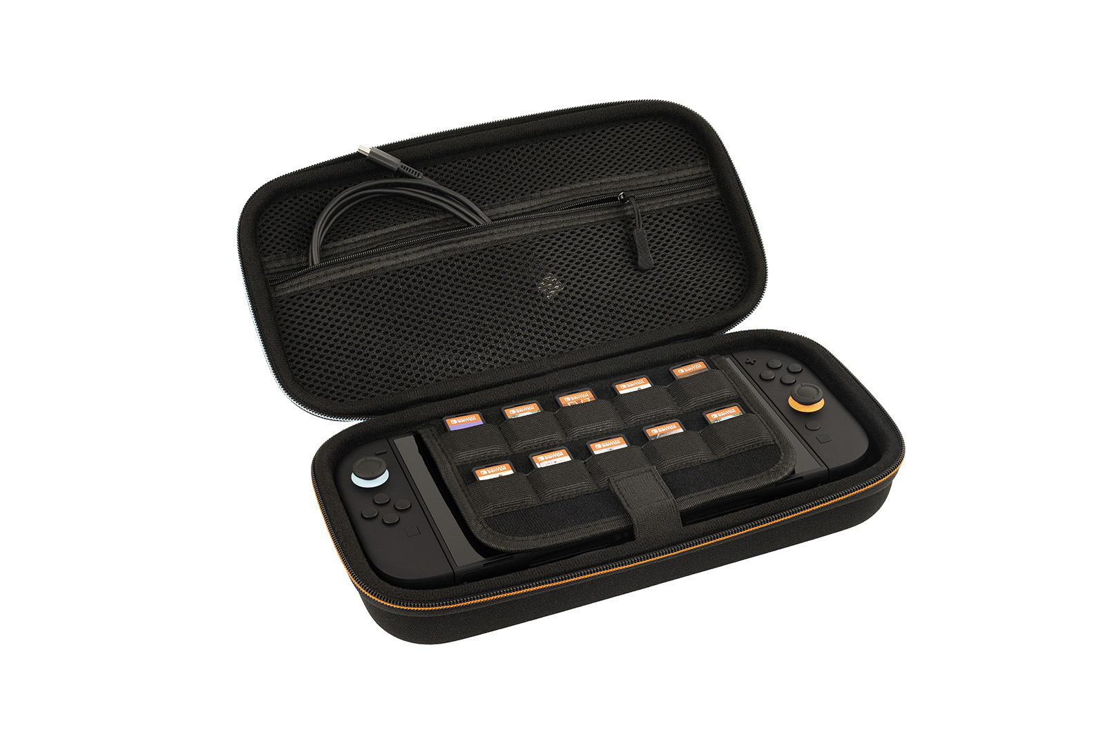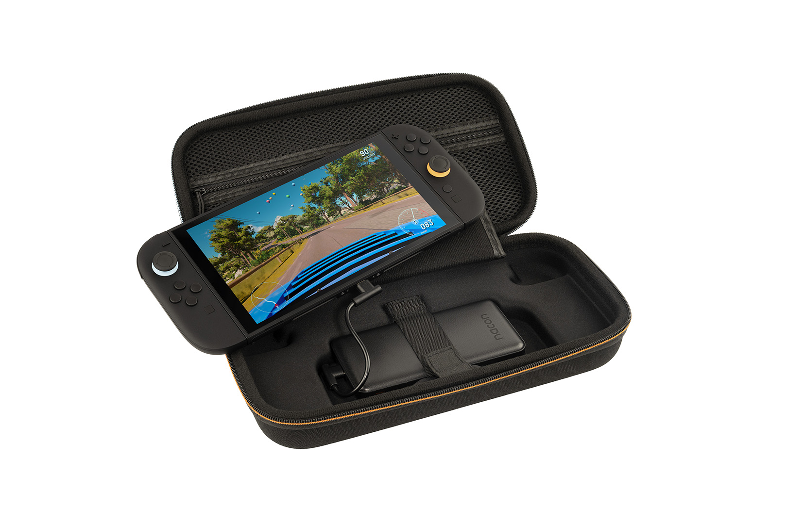 S tímto nabíjecím pouzdrem od společnosti Nacon, obsahujícím powerbanku o kapacitě 10 000 mAh, se už na cestách nebudete muset obávat toho, že se vám baterie v herní konzoli Nintendo Switch 2 vybije dřív, než dorazíte do cíle a budete moct znovu připojit konzoli k nabíječce. Powerbanka, podporující s pomocí přiloženého USB kabelu funkci rychlého nabíjení, vám umožní nabít až 1,5x baterii konzole, kdykoliv to bude zapotřebí – a dokonce při tom budete moct dál nerušeně pokračovat v hraní. Přepravní pouzdro uzavíratelné na zip je zároveň dostatečně pevné, aby v případě nárazu ochránilo před poškozením vaši konzoli i powerbanku, které se v něm navíc díky měkkému vnitřku budou cítit jako v bavlnce. Pouzdro dále obsahuje přepážku chránící obrazovku konzole před poškrábáním s kapsičkami pro deset herních karet a také síťovanou kapsu na zip pro uložení základního příslušenství. Pouzdro je rovněž kompatibilní s konzolemi Switch, Switch Lite a Switch – OLED Model.