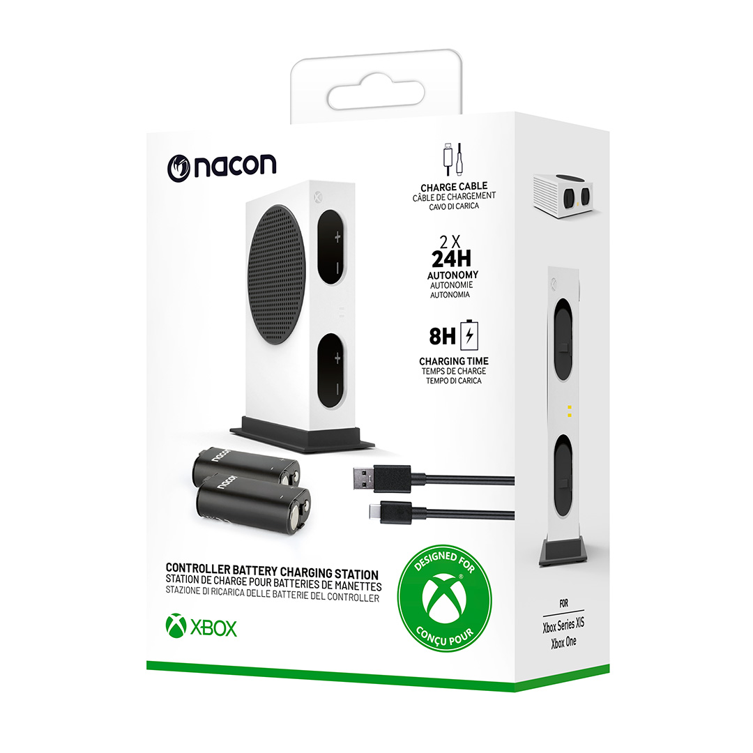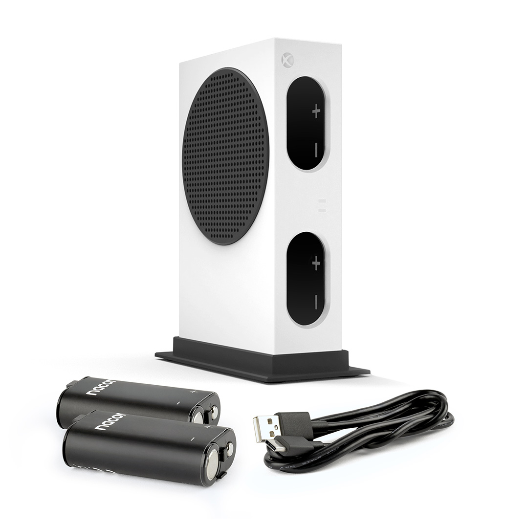 S touto designově netradiční, oficiálně licencovanou nabíjecí stanicí od společnosti Nacon, svým vzhledem připomínající herní konzoli Xbox Series S, a dvojicí náhradních baterií vás vybité tužkové baterie v herním ovladači Xbox už nikdy nezastaví. Stanice, kterou můžete napájet z herní konzole pomocí přiloženého USB kabelu, pojme najednou obě baterie, které poté dokáže plně nabít během osmi hodin, přičemž o aktuálním stavu nabíjení vás informují příslušné LED ukazatele. Baterie jsou kompatibilní se všemi oficiálními bezdrátovými ovladači pro herní konzole Xbox Series X|S a Xbox One a na jedno nabití vám umožní hrát až 24 hodin. A aby byla podoba s herní konzolí Xbox Series S dokonalá, můžete nabíjecí stanici umístit naležato nebo ji postavit na výšku s pomocí přiloženého vertikálního stojánku.